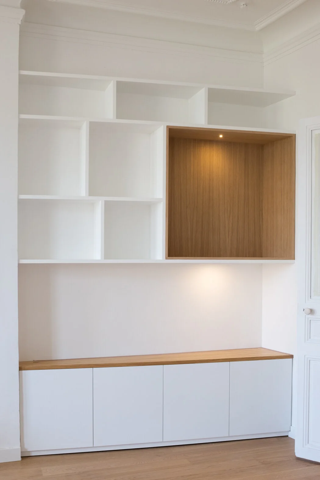• Bibliothèques avec éclairage intégré et soubassements fermés. Dressing et petit bureau